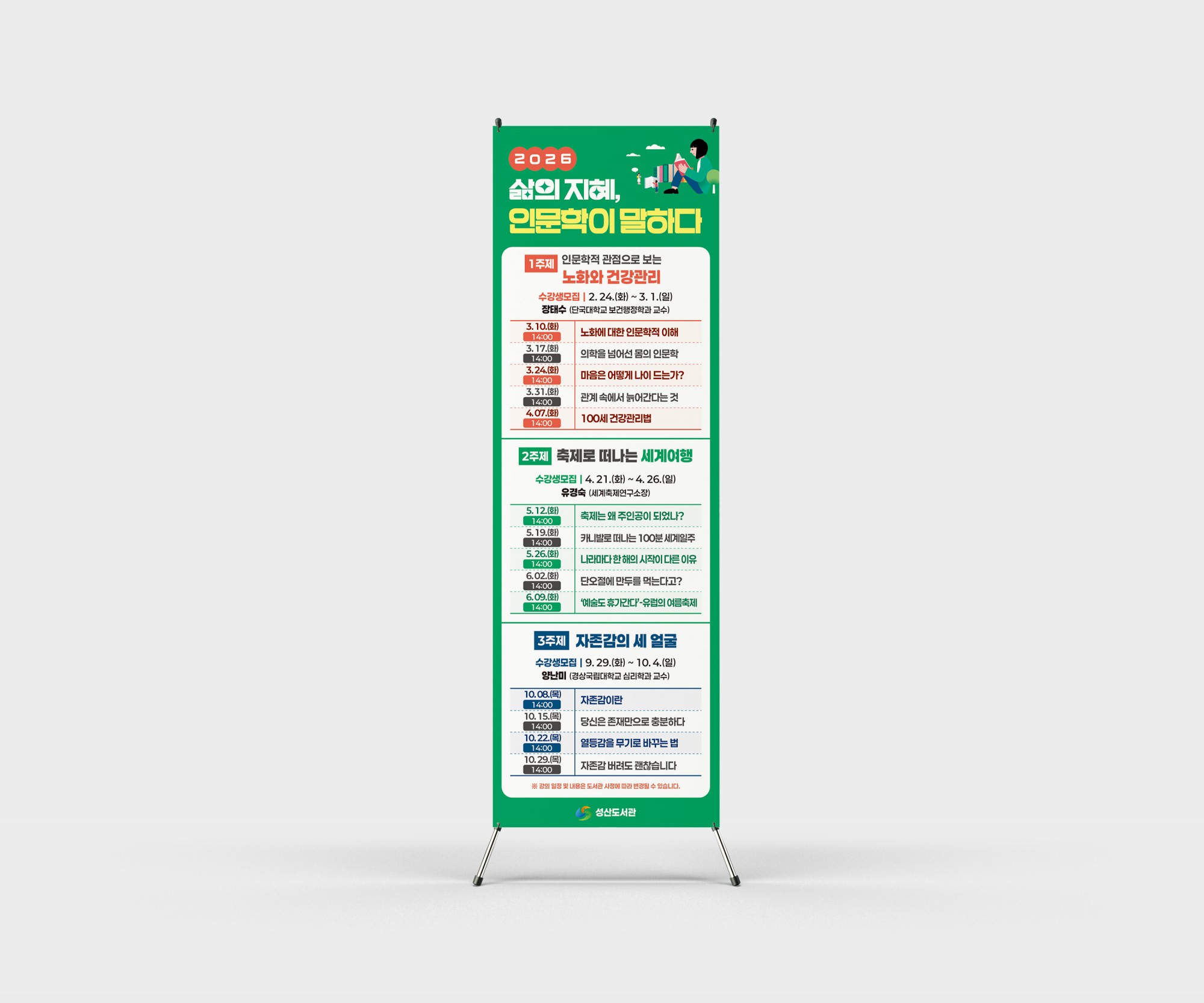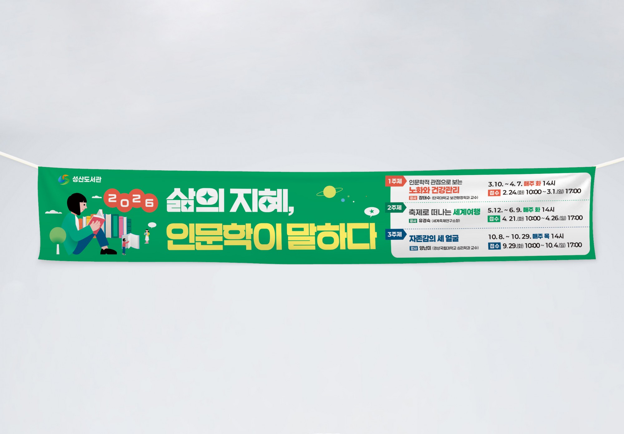 현수막 [성산도서관] '2026성산인문학' 현수막 / 배너 페이지 정보 작성자 관리자 댓글 0건 조회 2회 작성일 26-02-12 15:19 목록 본문 이전글[성산인문학] '인문학점 관점으로 보는 노화와 건강관리' 현수막 26.02.12 다음글[경상남도인재평생교육진흥원] '더배움' 매거진 26.01.02 댓글 0 댓글목록 등록된 댓글이 없습니다.